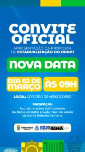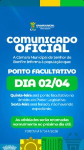Leia mais...A Câmara Municipal de Senhor do Bonfim convida todos para a cerimônia de posse dos eleitos para o mandato 2025-2028. 📅 Data: 1º de janeiro ⏰ Horário: 18h 📍 Local: Praça Juraci Magalhães (Praça da Igreja) Participe deste momento importante para o futuro de nossa cidade. Sua presença é muito especial! ASCOM – CMSB –…
