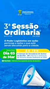 Leia mais...📢 Sessão Extraordinária na Câmara Municipal de Senhor do Bonfim Na próxima quinta-feira, dia 26, a partir das 15h, será realizada uma sessão extraordinária para apreciação, deliberação e votação de importantes Projetos de Lei oriundos do Poder Executivo: 1️⃣ Projeto de Lei Complementar do Poder Executivo nº 001/2024 “Dispõe sobre a edição da Nova Planta…