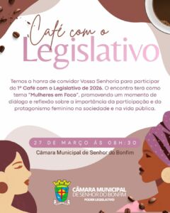 Temos a alegria de convidar você para participar do 1º Café com o Legislativo de 2026 💖 Com o tema “Mulheres em Foco”, esse será um momento especial de conversa, troca de experiências e reflexão sobre a força, a participação e o protagonismo feminino no nosso dia a dia e na vida pública. 📅 Data:…